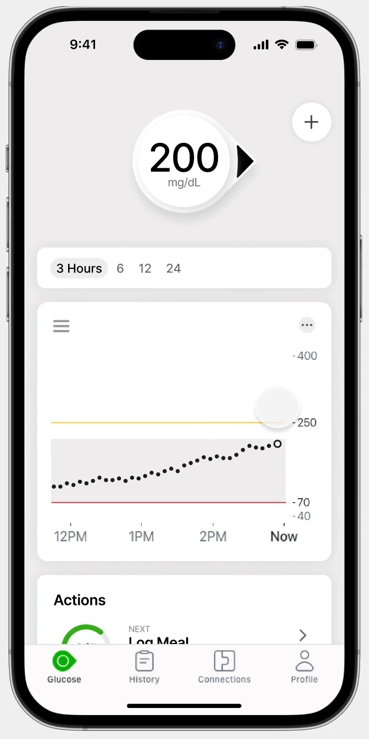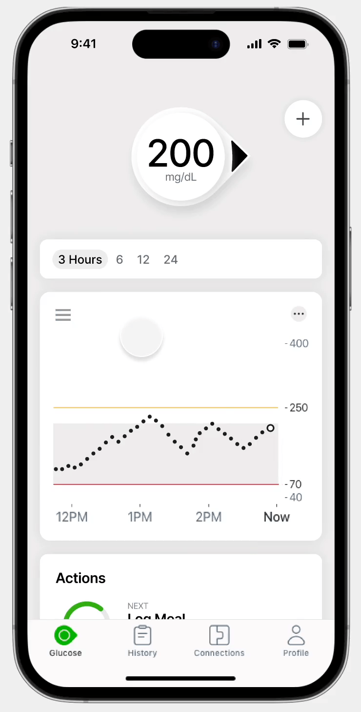 Actions Log + Recommendations: The goal is to provide users with task reminders to encourage users to be more mindful of their actions and utilize event logging more frequently. Further recommendations, such as predictive glucose readings and action items, are given to users after they interact with the app in any way.
