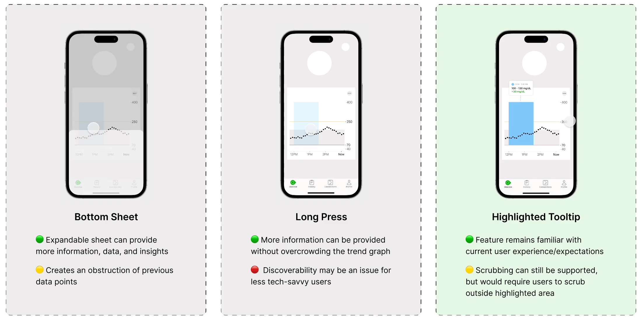 One of my ideas hinged on the idea of highlighting data within the trend graph and allowing users to gain more insight into the highlighted information. A common complaint about the G7 was that the interface was too plain and lacked visualization. Illustrating the relationships of data would add more visual cues to the user that allowed them to understand more about their health data.