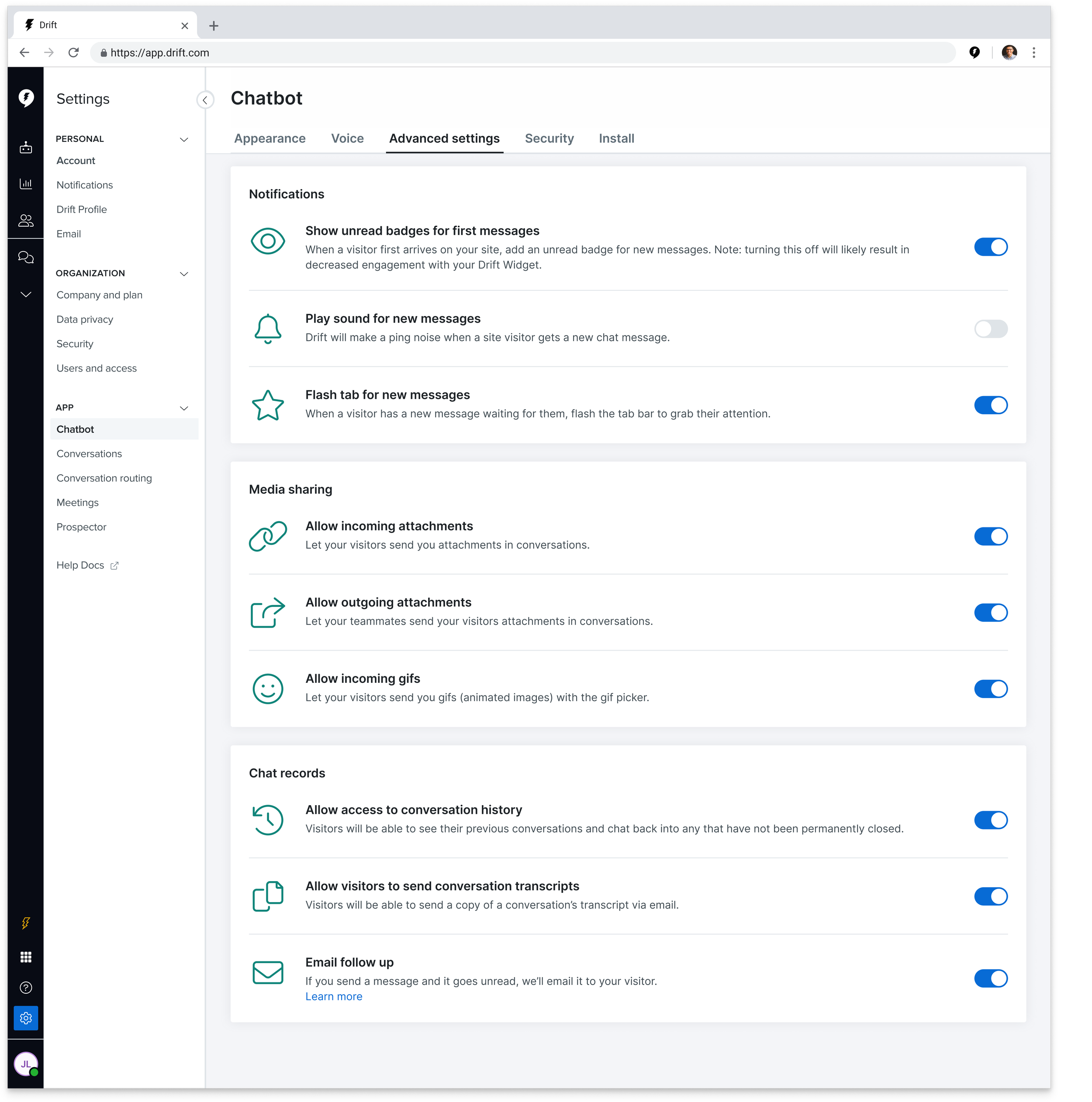 As there were a multitude of different settings within Drift, creating a singular standardized page that hosts all settings allows for a simple way to view, approach, and configure settings. Clear labeling, descriptive text, and intuitive grouping creates easily identifiable “buckets” of settings that a user can easily drill down into to make configurations.